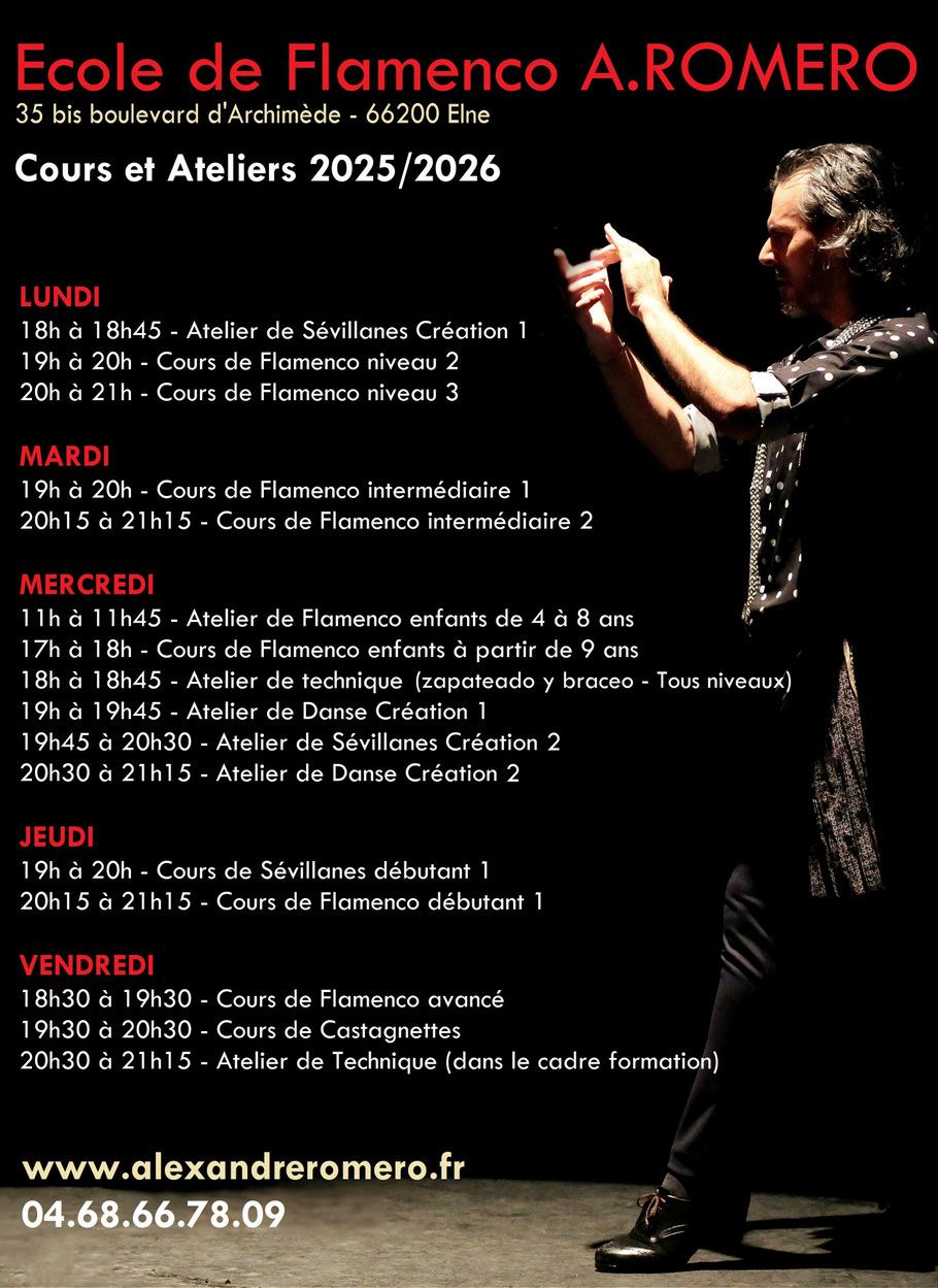 Ecole privée, (la seule du département) avec tout le confort : deux salles de danse, dont une avec un sol spécial pour le flamenco, miroirs, vestiaires, douche, salle d'attente, espace détente, boutique flamenca...lieu de partage et de convivialité, sous la direction artistique d'Alexandre ROMERO, professeur, chorégraphe, danseur, créateur et organisateur de plusieurs événements dans le milieu du flamenco, originaire d'Andalousie.